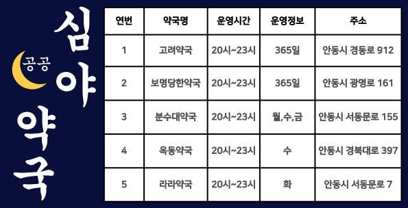 뉴한국방송뉴스통신사 신유철기자 기자 | 안동시는 시민의 의약품 접근성을 높이고 심야 시간대 의료 공백을 해소하기 위해 1월 1일부터 공공심야약국을 기존 2개소에서 5개소로 확대 지정해 운영 중이다.
