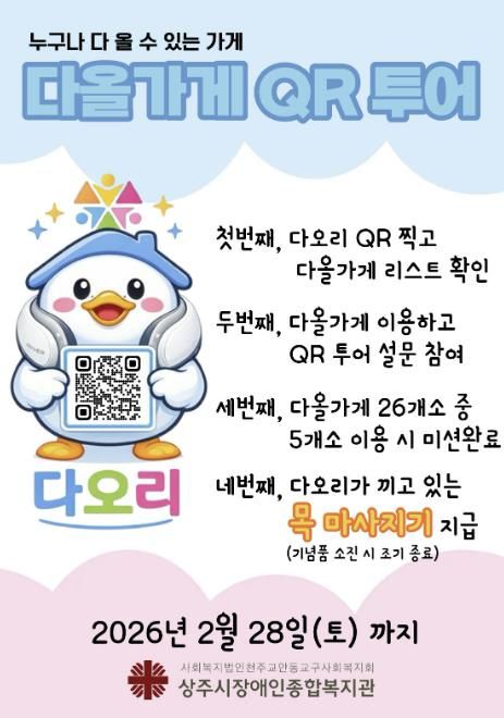 뉴한국방송뉴스통신사 신유철기자 기자 | 상주시장애인종합복지관은 1월 2일부터 2월 28일까지 지역 내 무장애 상가 이용을 활성화하기 위한‘다올가게 QR 투어’ 캠페인을 진행한다.