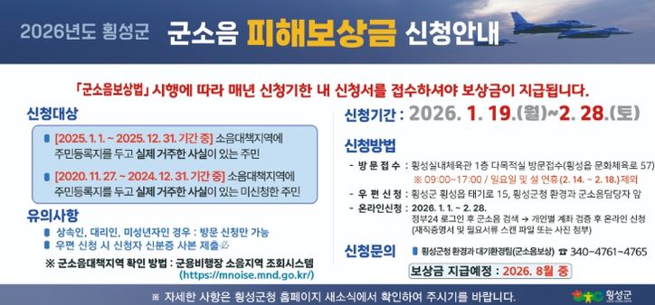 뉴한국방송뉴스통신사 양호선기자 기자 | 횡성군은 오는 19일부터 내달 28일까지 ‘2026년 군용기 소음피해 보상금’ 신청을 접수한다고 밝혔다.