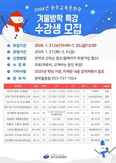 뉴한국방송뉴스통신사 양호선기자 기자 | 원주교육문화관(관장 용석태)은 1월 21일부터 23일까지 관내 초·중학생을 대상으로 겨울방학 특강 수강생을 모집한다.