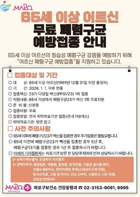 박강수 마포구청장은 “폐렴구균 감염은 면역력이 저하된 고령층에서 중증으로 이어지기 쉬운 만큼 65세 이상 어르신에게 예방접종이 꼭 필요하다”라며, “대상 어르신들께서는 가까운 의료기관을 통해 무료 접종을 받으시고 건강한 일상을 이어가시길 바란다”라고 말했다.