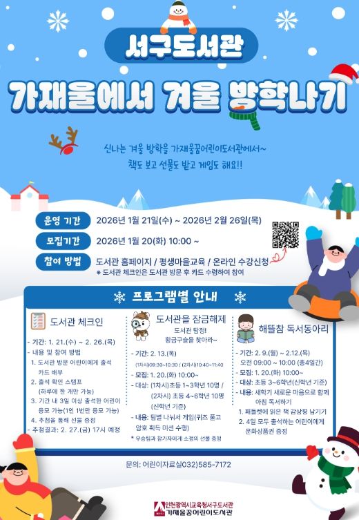 뉴한국방송뉴스통신사 신유철기자 기자 | 인천광역시교육청서구도서관은 겨울방학을 맞이한 어린이들이 도서관에서 특별하고 즐거운 경험을 쌓을 수 있는 '가재울에서 겨울 방학나기'를 21일부터 운영한다.