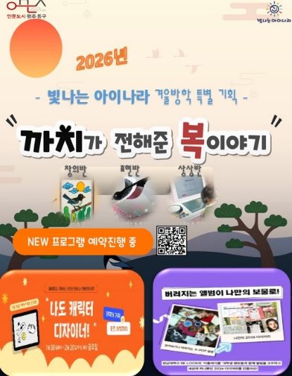 동구 관계자는 “빛나는 아이나라는 아이들이 놀이처럼 예술과 기술을 접하며 성장할 수 있는 도심 속 문화 놀이터”라면서 “겨울방학 동안 가족이 함께 참여해 의미 있는 추억을 만들 수 있는 시간이 되길 바란다”고 말했다.
