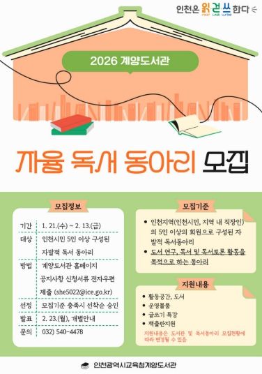 뉴한국방송뉴스통신사 신유철기자 기자 | 인천광역시교육청계양도서관은 지역 내 독서 문화를 확산하고 시민의 자발적인 독서 활동을 지원하기 위해 ‘2026년 자율 독서동아리’를 모집한다.
