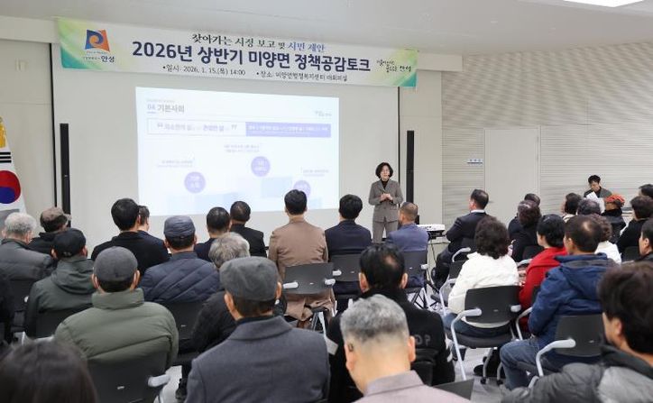 뉴한국방송뉴스통신사 신유철기자 기자 | 안성시 미양면은 지난 1월 15일, 미양면행정복지센터 대회의실에서 주민 120여 명이 참석한 가운데 ‘2026년 상반기 미양면 정책공감토크’를 성황리에 개최했다.