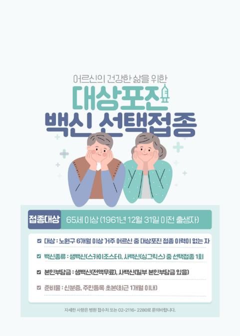 한편, 2026년 대상포진 무료 예방접종 지원 대상은 노원구에 6개월 이상 거주 중인 65세 이상 어르신(1961년 12월 31일 이전 출생자) 가운데 대상포진 예방접종 이력이 없는 경우다. 과거 대상포진을 앓았더라도 완치 후 6~12개월이 경과했다면 접종이 가능하다.