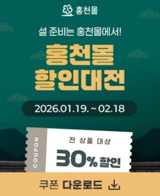뉴한국방송뉴스통신사 양호선기자 기자 | 홍천군 온라인 쇼핑몰 홍천몰은 설 명절을 맞아 고객 감사 행사로 전체 상품 30% 할인 쿠폰 기획전을 진행한다.