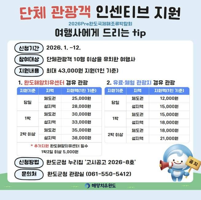 한편 완도해양치유센터를 경유하지 않고 유료·체험 관광지를 들를 시 오는 5월 2일부터 7일까지 개최되는 ‘2026 pre 완도국제해조류박람회장’을 필수로 방문해야 인센티브를 받을 수 있다.