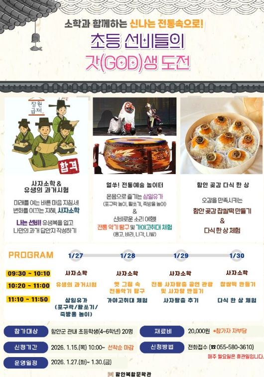 뉴한국방송뉴스통신사 신유철기자 기자 | 함안군은 겨울방학을 맞아 오는 1월 27일부터 30일까지 함안복합문학관에서 관내 초등학생을 대상으로 ‘겨울방학 서당 프로그램-초등 선비들의 갓(GOD)생 도전’을 운영한다고 밝혔다.