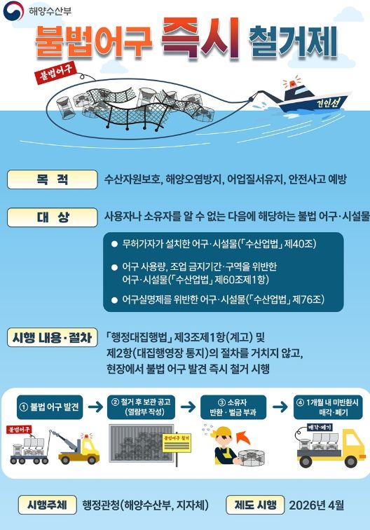 이번 ‘어구견인제’의 시행으로 법적 기반 강화와 함께 지속적이고 고질적인 불법 어구 문제 해결에 좋은 방안이 될 것으로 예상된다.