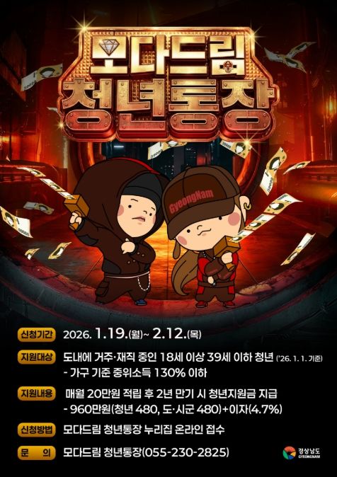 뉴한국방송뉴스통신사 신유철기자 기자 | 경상남도와 경남투자경제진흥원은 청년의 자산 형성과 지역 정착을 돕는 ‘모다드림 청년통장’ 상반기 참여자를 1월 19일부터 2월 12일까지 모집한다고 밝혔다.