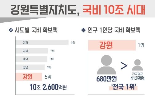 뉴한국방송뉴스통신사 신유철기자 기자 | 강원특별자치도는 국비 확보 10조 시대에 진입한 가운데, 인구 1인당 국비 확보액이 약 680만 원으로 전국 1위에 해당한다고 밝혔다.