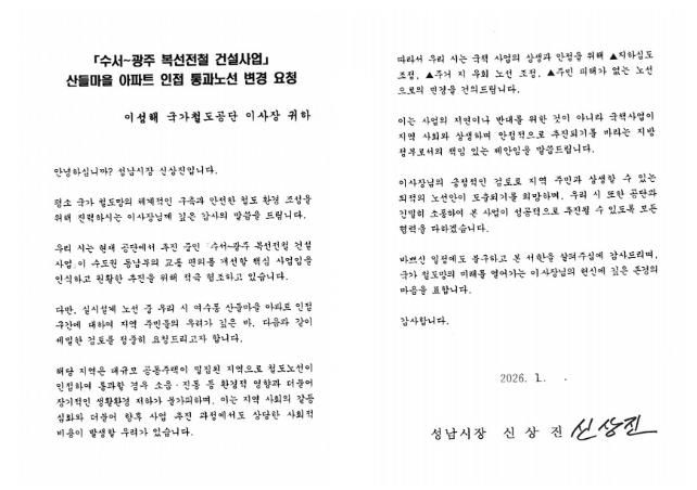뉴한국방송뉴스통신사 신유철기자 기자 | 성남시는 지난 16일 김윤덕 국토교통부 장관과 이성해 국가철도공단 이사장에게 ‘수서~광주 복선전철(이하 수광선) 건설사업’과 관련하여 여수동 산들마을 아파트 인접 통과 구간의 노선 변경을 요청하는 서한을 전달했다고 20일 밝혔다.