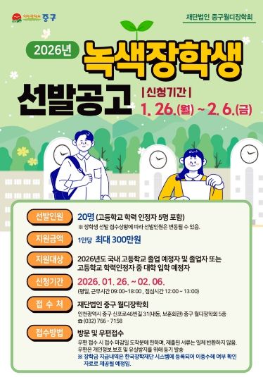 뉴한국방송뉴스통신사 신유철기자 기자 | 재단법인 인천 중구월디장학회(이사장 김정헌)는 지역 인재 육성을 위해 ‘2026년도 녹색 장학생’ 대상자를 모집한다고 20일 밝혔다.
