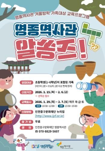 재단 관계자는 “겨울방학을 맞아 가족이 함께 영종도의 역사와 문화를 쉽고 재미있게 배울 수 있도록 이번 프로그램을 마련했다”라며, “체험과 놀이를 통해 지역 문화유산에 대한 관심을 높이는 계기가 되길 바란다”라고 전했다.