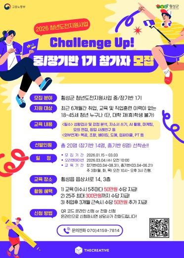 뉴한국방송뉴스통신사 양호선기자 기자 | 횡성군은 지역 청년들의 사회 진출과 성장을 지원하기 위해 ‘2026 청년도전지원사업’ 참여자를 모집한다고 밝혔다.