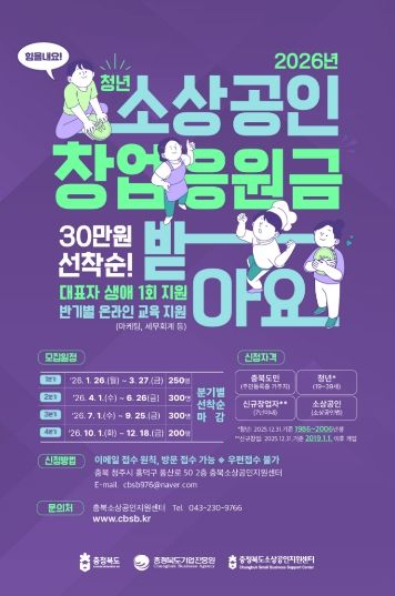 뉴한국방송뉴스통신사 권영분기자 기자 | 충북도와 (재)충청북도기업진흥원(소상공인지원센터)이 ‘2026년 청년 소상공인 창업응원금 지원사업’의 1분기 참여자 250명을 1월 26일부터 오는 3월 27일까지 선착순으로 모집한다.