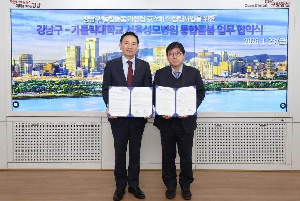 뉴한국방송뉴스통신사 신유철기자 기자 | 꿈이 모이는 도시, 미래를 그리는 강남구가 1월 23일 구청에서 가톨릭대학교 서울성모병원과 ‘강남구 통합돌봄 가정형 호스피스 협력사업’ 추진을 위한 업무협약(MOU)을 체결했다. 이 협약은 자치구와 상급종합병원이 연계해 가정형 호스피스를 지원하는 체계를 공식화했다는 점에서 그 의미가 크다.