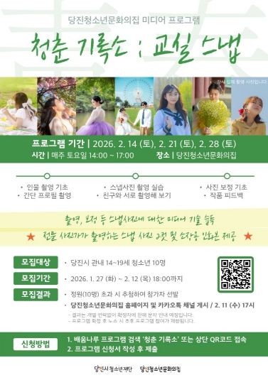 뉴한국방송뉴스통신사 신태공 기자 | (재)당진시청소년재단 당진청소년문화의집(관장 유수민)은 오는 2월 14일부터 28일까지 매주 토요일, 14시부터 17시까지 관내 14~19세 청소년을 대상으로 미디어 프로그램 [청춘 기록소 : 교실 스냅]을 운영할 예정이다.