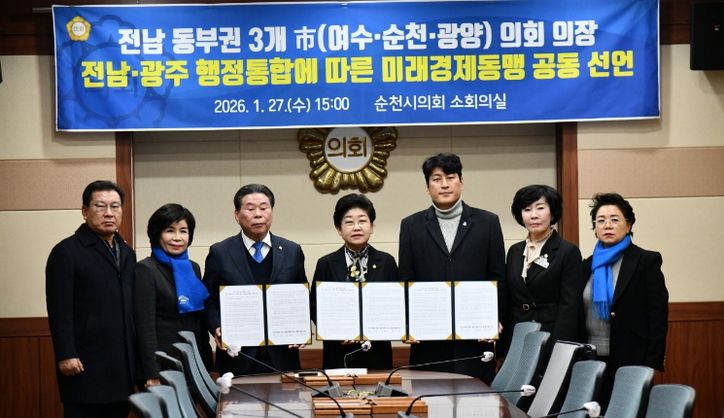 뉴한국방송뉴스통신사 신다은기자 기자 | 여수시의회는 27일 오후 3시 순천시의회 의장실에서 강형구 순천시의회 의장, 최대원 광양시의회 의장과 함께 '전남·광주 행정통합에 따른 전남동부권(여수·순천·광양) 미래경제동맹 공동선언문'을 발표했다.