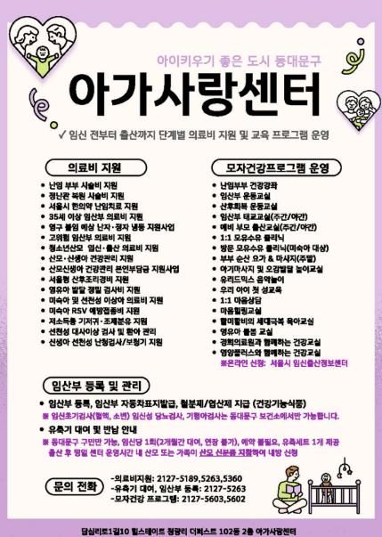 프로그램 신청·문의는 동대문구 아가사랑센터를 통해 안내받을 수 있다. 아가사랑센터는 청량리역 6번 출구 인근(서울 동대문구 답십리로1길 10, 2층)에 위치한 모자보건센터로, 임신·출산·육아 단계별 프로그램과 상담도 운영한다.