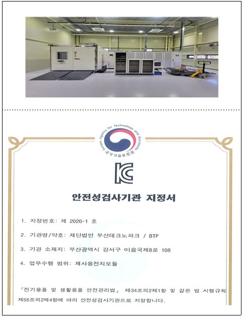 이번 자격 취득을 통해 (재)부산테크노파크는 'KC10031' 기준에 따른 사용후 배터리 안전성 검사를 공식 수행할 수 있게 됐다.