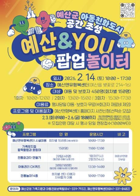 뉴한국방송뉴스통신사 신태공 기자 | 예산군은 아동친화도시 공간 조성의 하나로 아동과 가족이 함께 즐길 수 있는 ‘예산앤유(&YOU) 팝업(한시운영) 놀이터’를 2월 14일 예산앤유행복센터에서 운영한다고 밝혔다.
