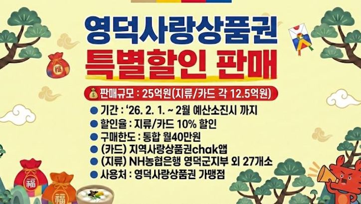 뉴한국방송뉴스통신사 신유철기자 기자 | 영덕군은 설 명절을 앞두고 지역 상권 활성화와 소비 촉진을 위해 2월 1일부터 ‘영덕사랑상품권’을 10% 특별 할인 판매한다.