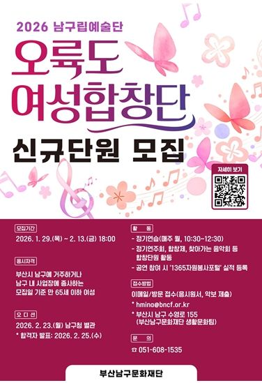 뉴한국방송뉴스통신사 신유철기자 기자 | (재)부산남구문화재단은 남구립 오륙도여성합창단의 2026년 신규 합창단원을 1월 29일부터 2월 13일까지 공개 모집한다고 밝혔다.