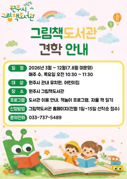 뉴한국방송뉴스통신사 양호선기자 기자 | 원주시 그림책도서관은 오는 3월부터 12월까지 관내 유치원과 어린이집을 대상으로 어린이 견학 프로그램을 운영한다.