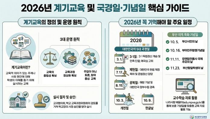 이번 홍보 강화는 시기별로 교육적 의미가 있는 주제를 다루는 ‘계기교육’의 현장 활용도를 높여, 학생들이 부산의 주요 기념일을 이해하고 그 역사적 의미를 자연스럽게 인식할 수 있도록 하기 위한 것이다.
