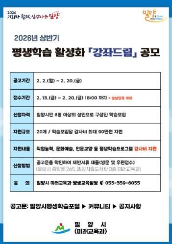 뉴한국방송뉴스통신사 신유철기자 기자 | 경남 밀양시는 시민이 원하는 시간과 장소에 맞춤형 평생학습 프로그램을 제공하는 2026년 상반기 평생학습 활성화 사업 ‘강좌드림’의 공모를 추진하고, 오는 13일부터 신청을 받는다고 밝혔다.