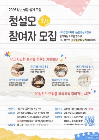 유유기지 부평 관계자는 “청설모는 청년들이 자신의 생활을 주도적으로 설계하고, 기록을 통해 변화를 체감할 수 있도록 돕는 프로그램”이라며 “함께 실천하고 서로를 응원하는 과정을 통해 청년들의 일상에 긍정적인 변화가 쌓이길 기대한다”고 말했다.