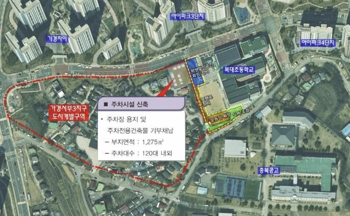 이범석 청주시장은 이 같은 문제를 해소하기 위해 특단의 조치방안 마련을 지시했고, 시 도시개발과는 가경서부3지구 사업 시행사와 지속적인 협의를 통해 가경동 2282 일원 부지면적 1,275㎡에 120대 내외 차량 주차가 가능한 주차전용 건축물을 공공기여 방식으로 조성하는 내용을 실시계획에 반영했다.
