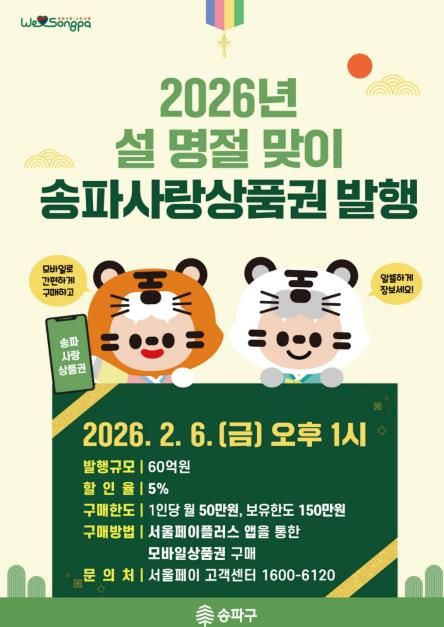 서강석 송파구청장은 “명절을 앞두고, 구민들이 장보기와 외식 등 상황에 맞춰 상품권을 유연하게 활용하실 수 있도록 발행 체계를 세심하게 준비했다”며, “지역 상품권을 통해 위축된 소비심리를 되살리고, 소상공인의 매출 증대로 이어져 지역사회 경제 선순환에 도움이 되길 바란다.”고 전했다.