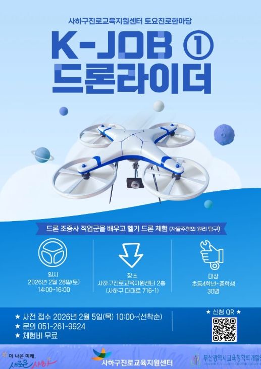 이번 프로그램은 K-JOB 드론 라이더 직업군에 대해 알아보고, 헬기 드론을 활용한 자율주행 원리를 체험·탐구해 보는 시간으로 2월 28일 토요일 오후 2시부터 사하구진로교육지원센터 2층에서 진행된다.