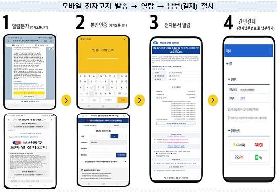 뉴한국방송뉴스통신사 신유철기자 기자 | 부산시는 기존 우편(종이) 송달하고 있는 지방세 관련 각종 고지·안내문을 전자문서 형태로 공인전자문서중계자(카카오, KT, SKT, LGU+) 문자 메시지로 전송하는 '모바일 전자고지 서비스'를 2월부터 본격 시행한다고 밝혔다.