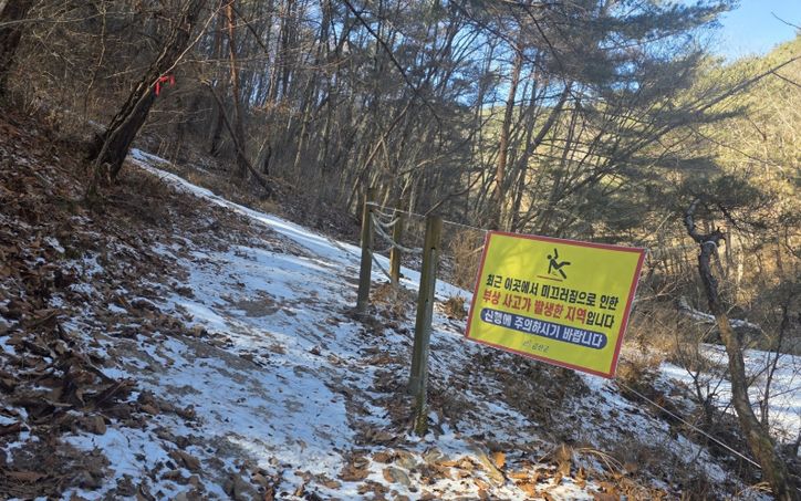 군은 십이폭포 중 운옥폭포(제9폭포)에 미끄럼 주의 현수막을 설치했다.