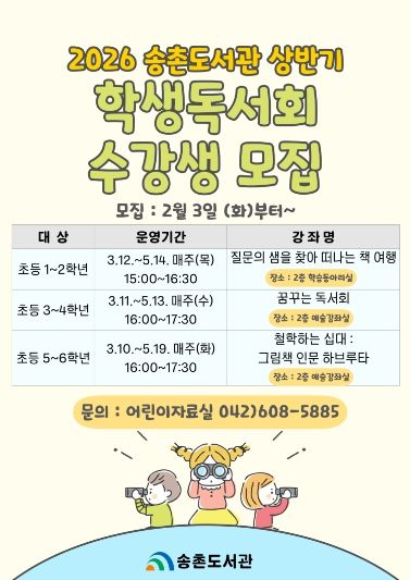 뉴한국방송뉴스통신사 신태공 기자 | 대전 대덕구 송촌도서관은 어린이들의 올바른 독서 습관 형성과 창의적 사고력 증진을 위해 ‘2026년 상반기 학생독서회’ 수강생을 모집한다.