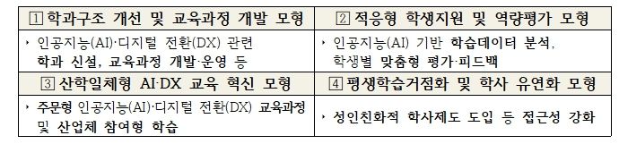 교육부는 2026년 신규 사업 공모를 통해 총 24개 내외 사업단(전문대학)을 선정하여 사업단별 최대 10억 원(총 240억 원)을 지원할 예정이다. 주요 추진 내용으로는 ▲인공지능(AI)·디지털 전환(DX) 환경 조성, ▲재학생·교직원·지역주민 맞춤형 인공지능(AI) 역량 강화, ▲대학별 특화모형 구축이 있다.