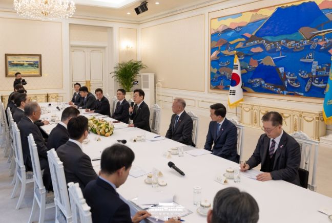 이 대통령은 이날 오후 청와대에서 열린 '청년 일자리와 지방투자 확대를 위한 기업간담회'를 갖고 이 같이 말했다. 이날 간담회에는 류진 한경협 회장과 함께 삼성 이재용 회장, SK 최창원 부회장, 현대차 정의선 회장, LG 구광모 회장, 롯데 신동빈 회장, 포스코 장인화 회장, 한화 김동관 부회장, HD 현대 정기선 회장, GS 허태수 회장, 한진 조원태 회장 등 10명의 기업인이 참석했다.