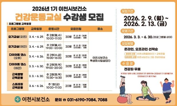 뉴한국방송뉴스통신사 신유철기자 기자 | 이천시보건소는 시민들이 건강생활을 실천할 수 있도록 ‘2026년 건강운동교실 1기’ 참여자를 선착순으로 모집한다.