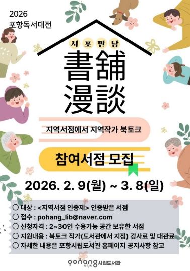 뉴한국방송뉴스통신사 신유철기자 기자 | 포항시는 오는 9일부터 내달 8일까지 ‘2026 포항독서대전’ 연간 프로그램인 ‘서포만담(書舖漫談)’에 참여할 지역 서점을 모집한다.