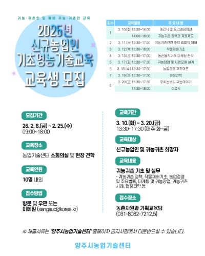 뉴한국방송뉴스통신사 신유철기자 기자 | 양주시는 농촌지역으로 이주한 귀농․귀촌인과 예비 귀농인의 안정적인 농촌 정착을 지원하기 위해 ‘2026년 신규농업인 기초영농기술교육’ 교육생을 모집한다.