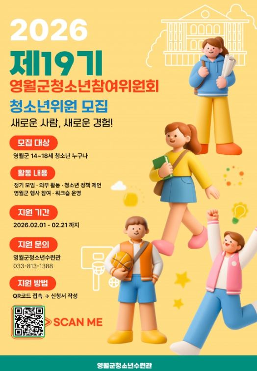 뉴한국방송뉴스통신사 양호선기자 기자 | 영월군청소년수련관은 관내 중~고등학교 청소년을 대상으로 오는 21일(토)까지 영월군청소년참여기구 신규, 연임 위원을 추가 모집한다.