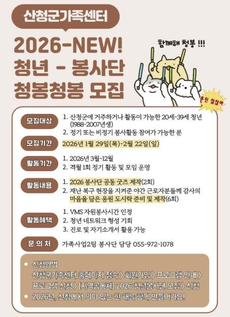 뉴한국방송뉴스통신사 신유철기자 기자 | 산청군가족센터는 2월 22일까지 가족봉사단-청년 대상 봉사단 '청봉청봉'을 모집한다고 11일 밝혔다.