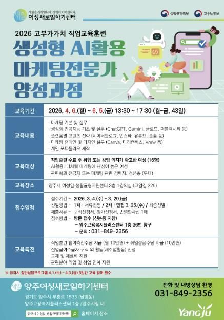 뉴한국방송뉴스통신사 신유철기자 기자 | 양주여성새로일하기센터에서는 오는 3월 4일부터 20일까지 직업교육훈련 과정인 ‘생성형 인공지능(AI)활용 마케팅전문가 양성과정' 교육생을 모집한다.
