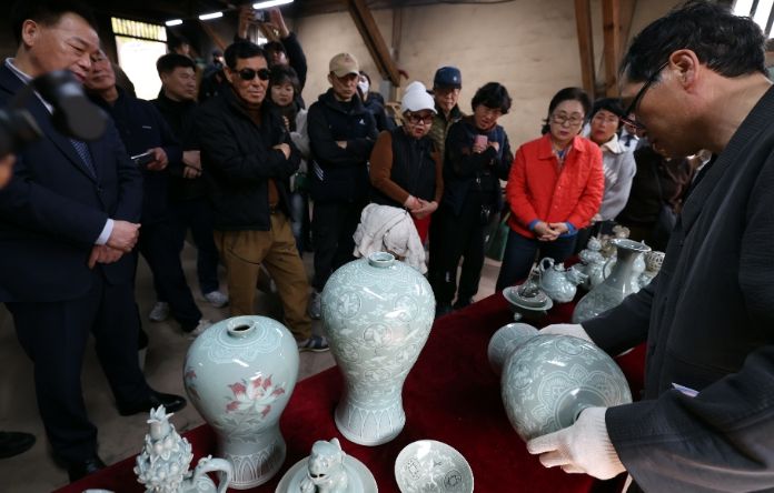 지난 22일 강진군 대구면 고려청자박물관 제2호가마에서 화목가마 요출행사가 열린 가운데 옛 전통방식 그대로 소나무 장작을 이용해 48시간 동안 구워낸 청자를 꺼내고 있다.