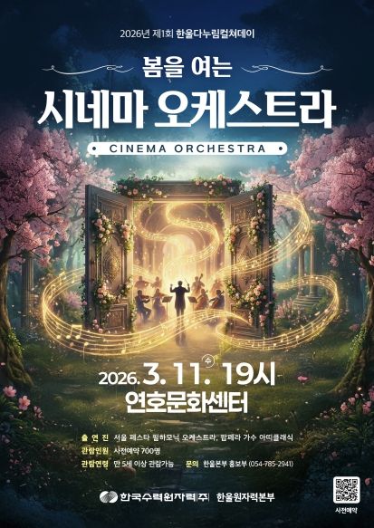 뉴한국방송뉴스통신사 신유철기자 기자 | 한국수력원자력(주) 한울원자력본부는 3월 11일 19시 울진군 연호문화센터에서 제1회 한울다누림컬쳐데이 '봄을 여는 시네마 오케스트라'를 개최한다.