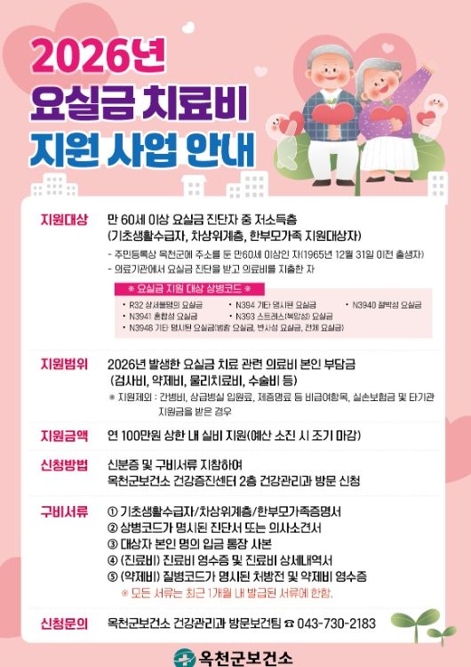 이번 사업은 만 60세 이상 옥천군민 가운데 의료기관에서 요실금 진단을 받은 저소득층을 대상으로 하며, 경제적 부담으로 치료를 미루는 사례를 줄이고 조기 치료를 유도하기 위해 마련됐다.